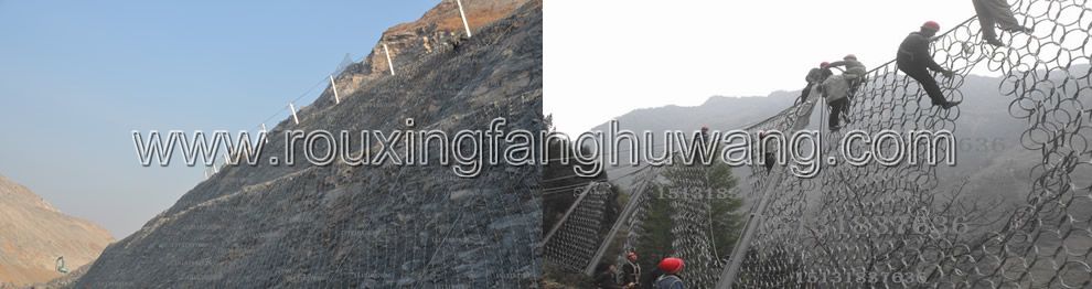 是以钢丝绳网为主的各类柔性网覆盖包裹在所需防护斜坡或岩石上,以限制坡面岩石土体的风化剥落或破坏以及为岩崩塌(加固作用),或将落石控制于一定范围内运动(围护作用)。