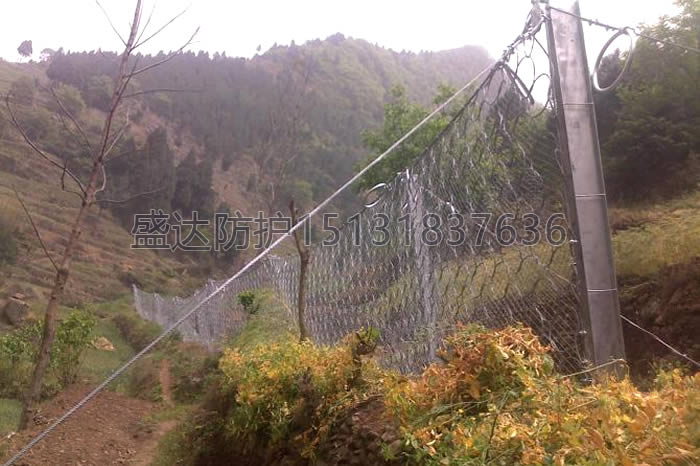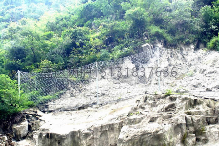 被动防护网是由钢丝绳网、环形网、(需拦截小块落石时附加一层铁丝格栅)、固定系统(锚杆、拉锚绳、基座和支撑绳)减压环和钢柱四个主要部分构成。钢柱和钢丝绳网连接组合构成一个整体,对所防护的区域形成面防护,从而阻止崩塌岩石土体的下坠,起到边坡防护作用。