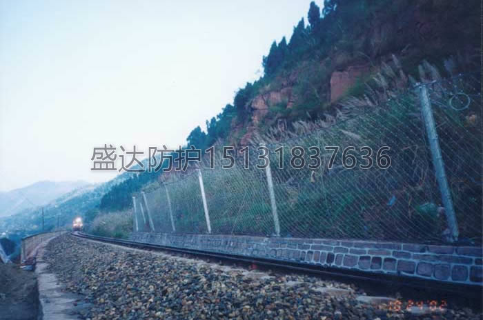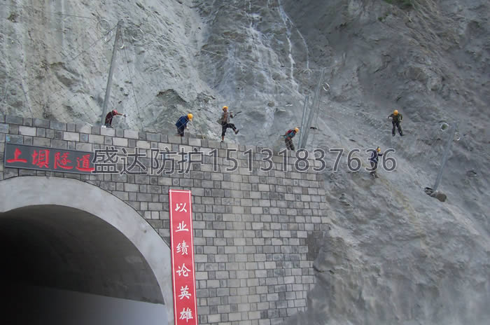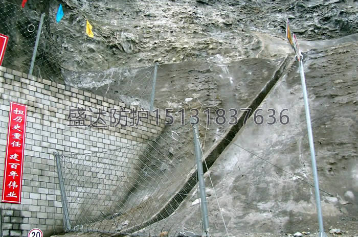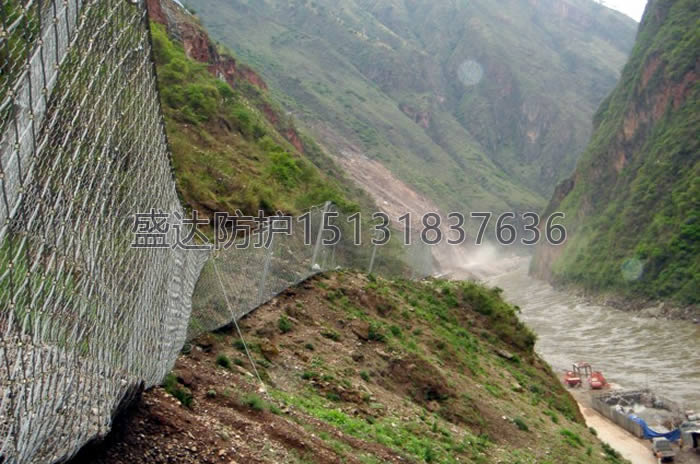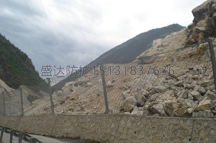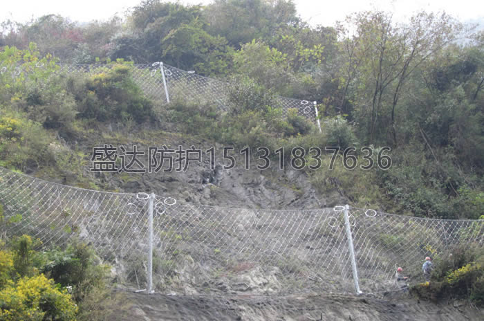 被动防护网是由钢丝绳网、环形网、(需拦截小块落石时附加一层铁丝格栅)、固定系统(锚杆、拉锚绳、基座和支撑绳)减压环和钢柱四个主要部分构成。钢柱和钢丝绳网连接组合构成一个整体,对所防护的区域形成面防护,从而阻止崩塌岩石土体的下坠,起到边坡防护作用。